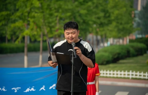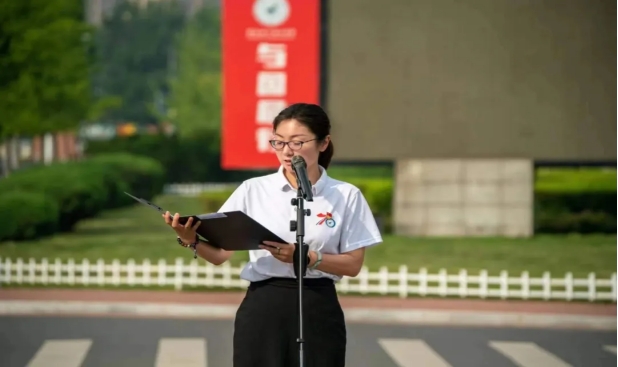 学生会主席杨佳佳发表国旗下演讲,他表示作为新世纪的大学生,应该奏响自立的青春之歌,面向世界、面向未来,报效祖国。