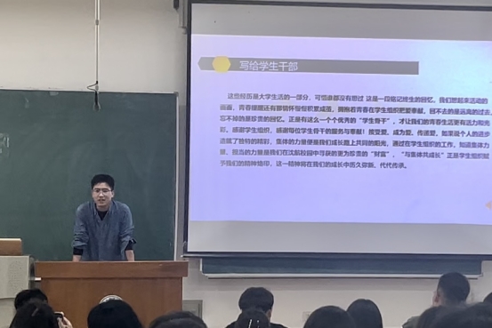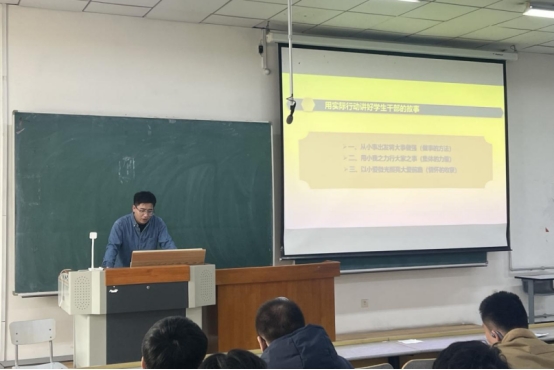 战明兴老师结合自身的学生工作经验,结合“做事的方法”“集体的力量”“成长的收获”三个方面,从信念、学习、行动、心态、时间、情怀六个方向的工作经验用最贴近青年的方式分享给同学们。